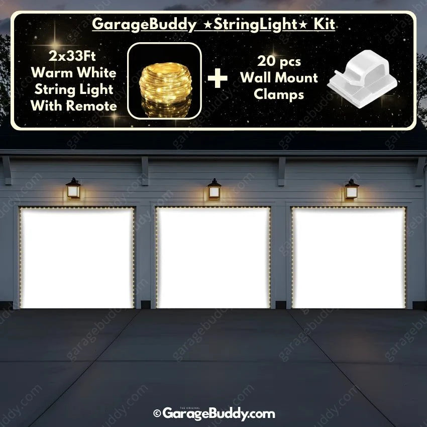 You now have an option to add the GarageBuddy string light kit to your order at 50% off and turn your garage into a true winter wonderland. The kit includes 1x 33 ft warm white string light, a remote control and 10x sticky wall mount clamps. The 2-door garage option comes with 2 string light kits. The lights work on three AA batteries (not included), so you don't need to run around finding electrical outlets.