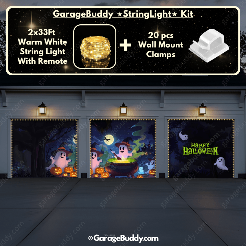 You now have the option to add the GarageBuddy string light kit to your order at 50% Off and turn your Halloween garage door cover into a true showstopper. The kit includes 1x 33 ft warm white string light, a remote control, and 10x sticky wall mount clamps. The 2-door garage option comes with 2 string light kits. The lights work on three AA batteries (not included), so you don’t need to run around finding electrical outlets.