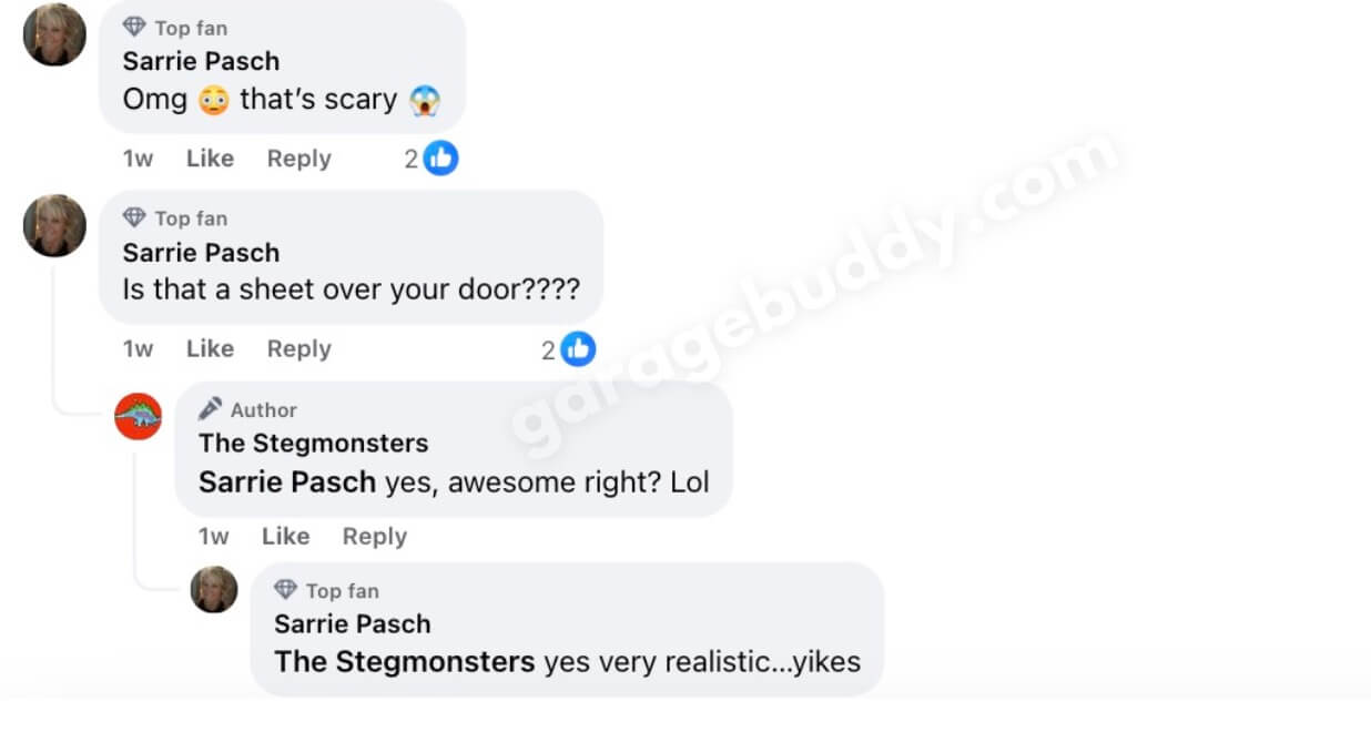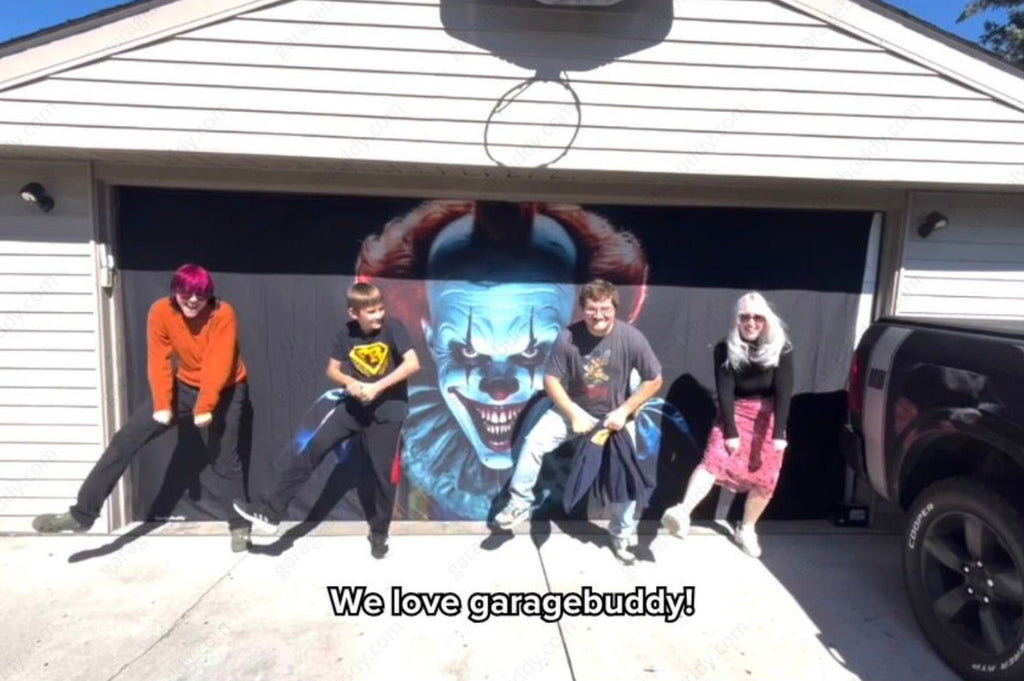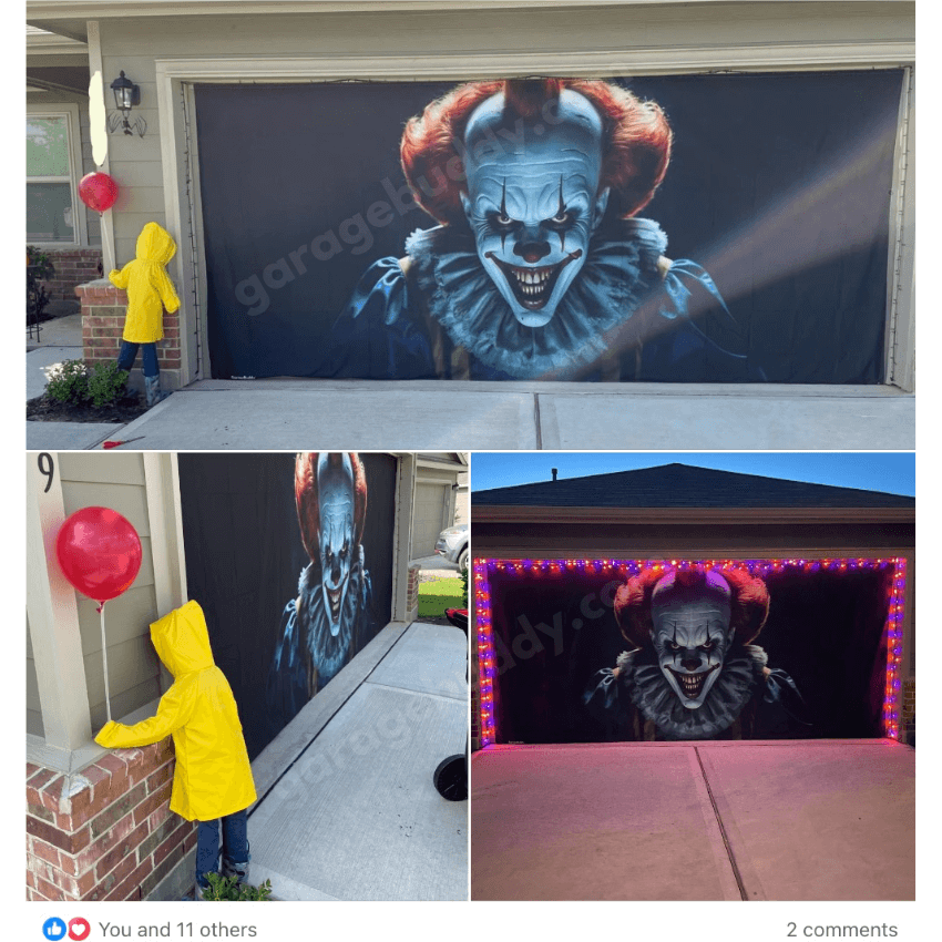 GarageBuddy has gone viral, inspiring over 1,000+ posts across social media in no time. Homeowners everywhere are showing off their creepy garage door covers as part of their outdoor Halloween decorations. (Images shown below are from the original creators, not us.)