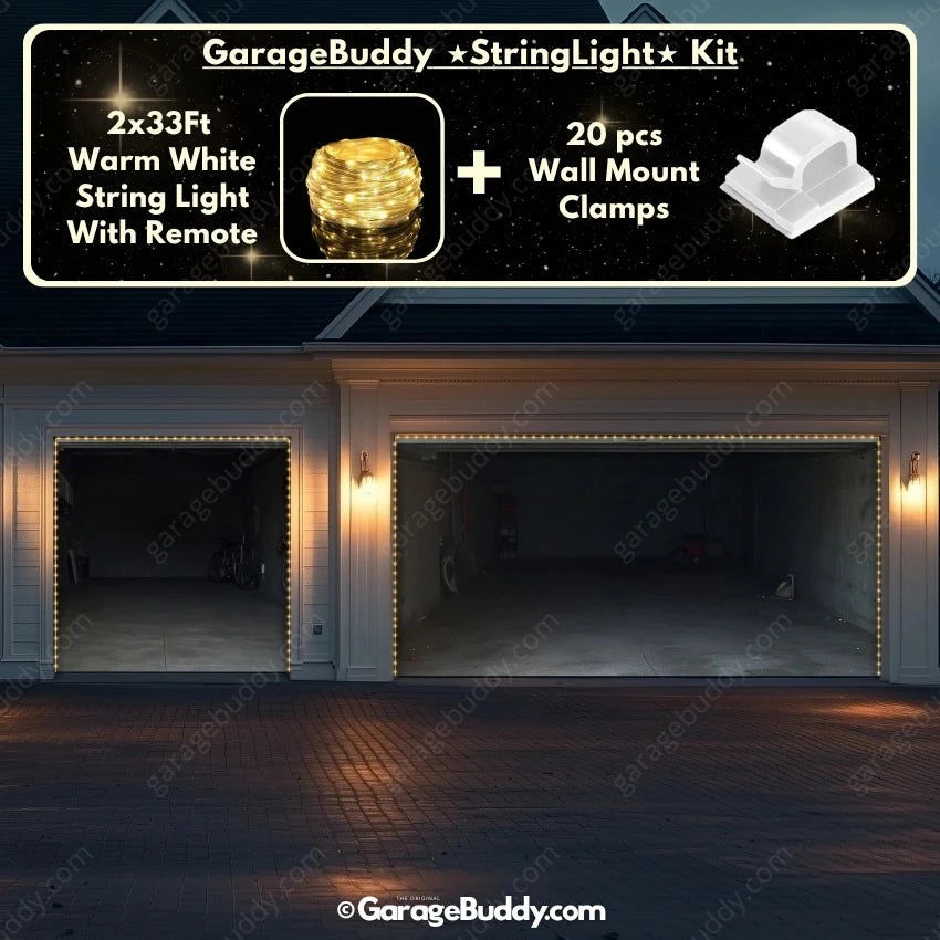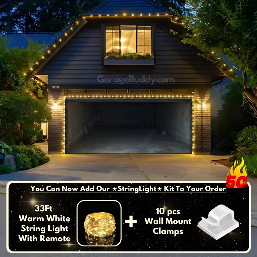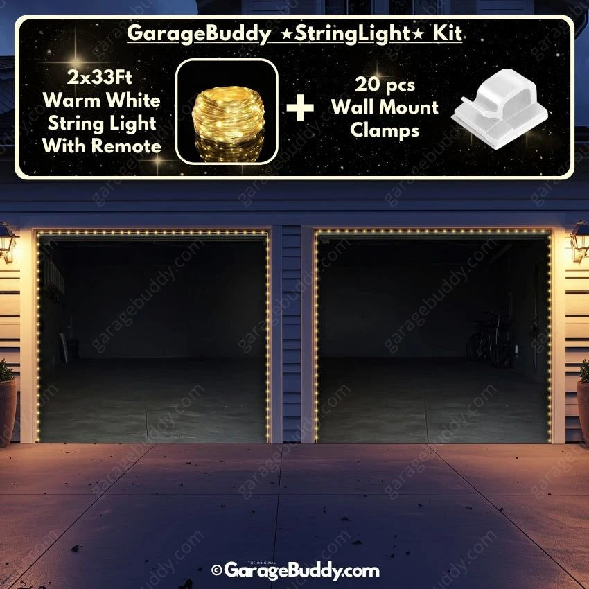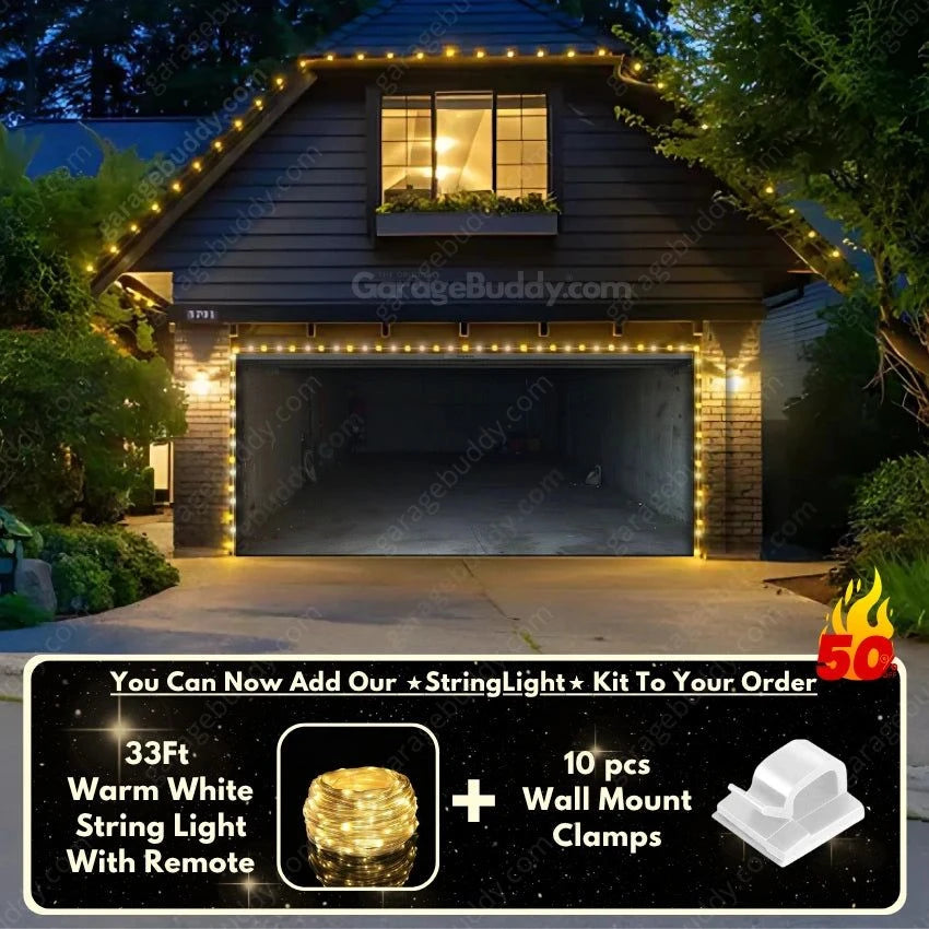 You now have the option to add the GarageBuddy string light kit to your order at 50% Off and turn your garage into a true showstopper. The kit includes 1x 33 ft warm white string light, a remote control, and 10x sticky wall mount clamps. The 2-door garage option comes with 2 string light kits. The lights work on three AA batteries (not included), so you don't need to run around finding electrical outlets.