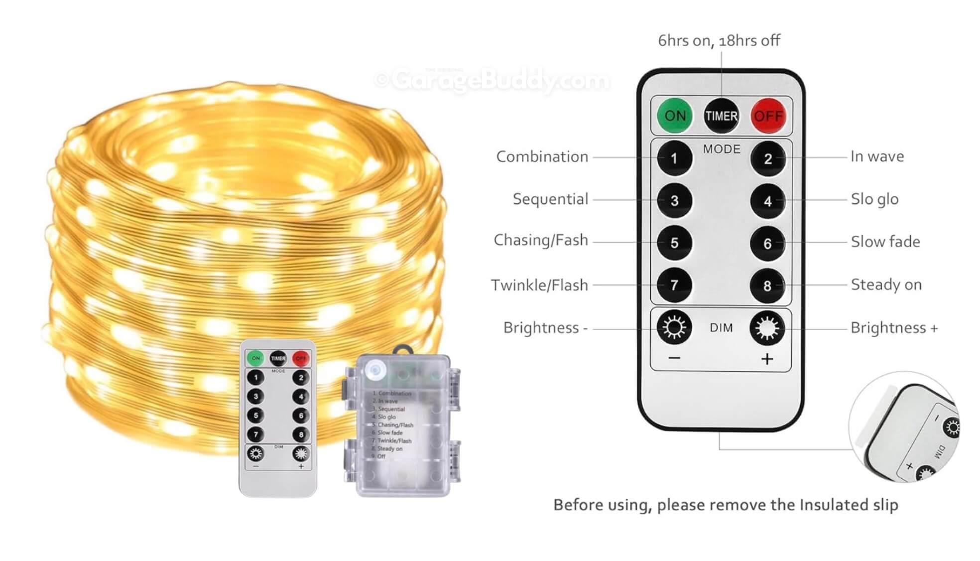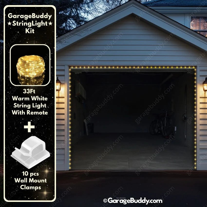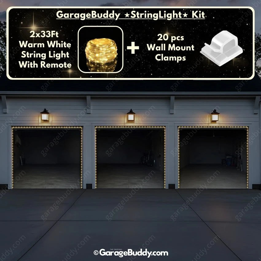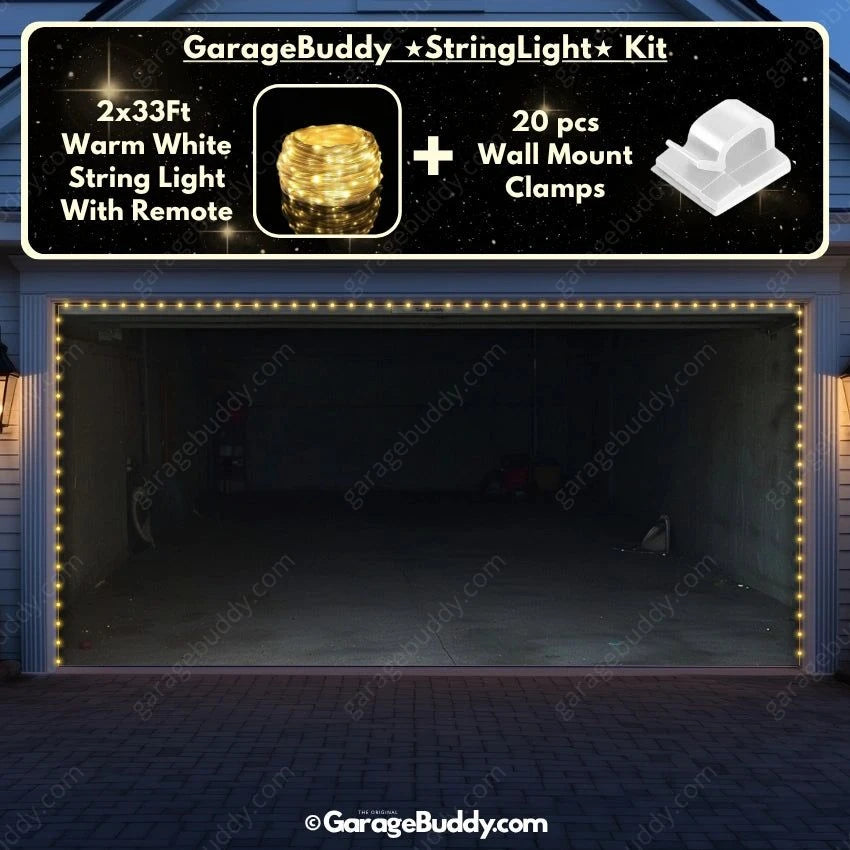 You now have the option to add the GarageBuddy string light kit to your order at 50% Off and turn your garage into a true showstopper. The kit includes 1x 33 ft warm white string light, a remote control, and 10x sticky wall mount clamps. The 2-door garage option comes with 2 string light kits. The lights work on three AA batteries (not included), so you don't need to run around finding electrical outlets.