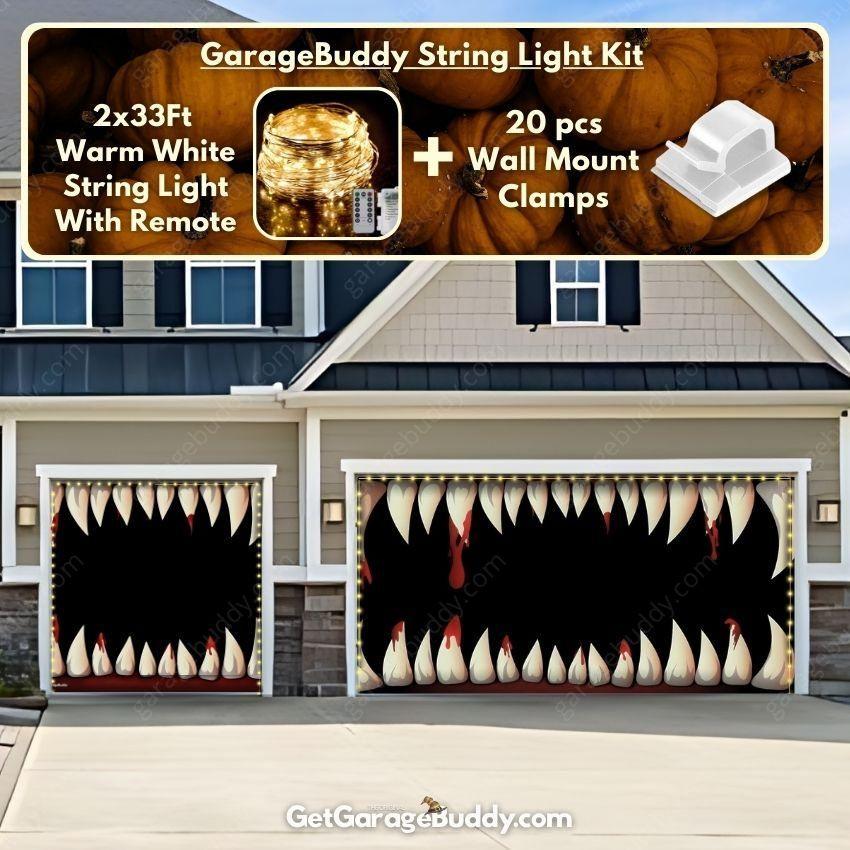 You now have the option to add the GarageBuddy string light kit to your order at 50% off and turn your garage into a true haunted showstopper. Pair your Halloween garage door cover with these glowing lights for the ultimate outdoor Halloween decoration. The kit includes 1x 33 ft warm white string light, a remote control, and 10x sticky wall mount clamps. The 2-door garage option comes with 2 string light kits. The lights work on three AA batteries (not included), so there's no need to worry about outlets.