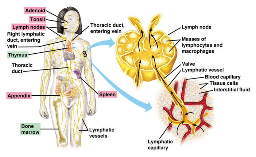 The lymphatic system is an extensive network of vessels, nodes, and ducts that pass through almost all bodily tissues. It allows the circulation of a fluid called lymph through the body in a similar way to blood. This is essential for fluid balance , absorption of fatty acids in the stomach , and immune system regulation .