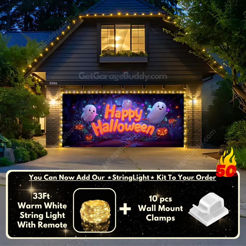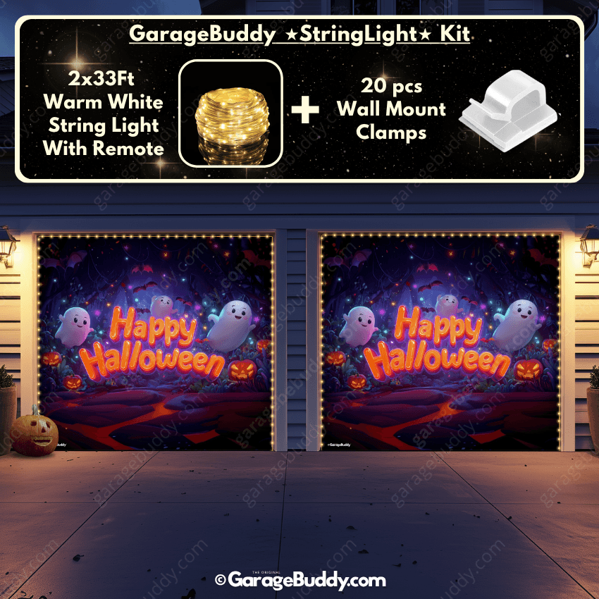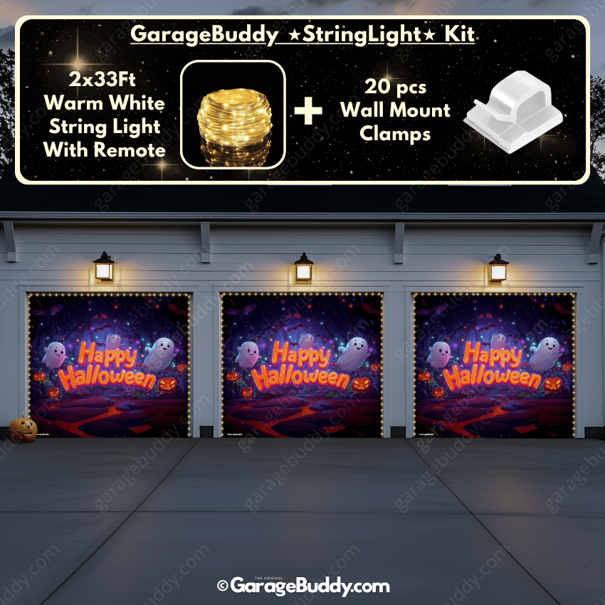 You now have the option to add the GarageBuddy string light kit to your order at 50% off and turn your garage into a true showstopper. The kit includes 1x 33 ft warm white string light, a remote control, and 10x sticky wall mount clamps. The 2-door garage option comes with 2 string light kits. The lights work on three AA batteries (not included), so you don't need to run around finding electrical outlets. Pair them with a Spooky Garage Door Cover for the ultimate haunted vibe.