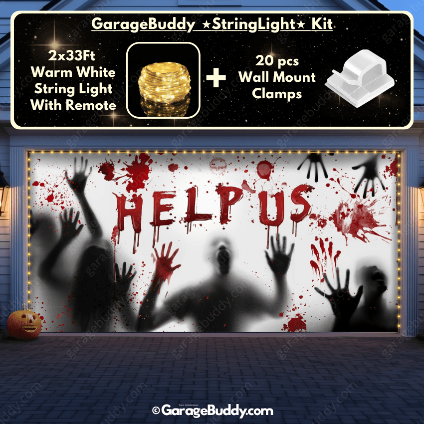 You now have the option to add the GarageBuddy string light kit to your order at 50% Off and turn your creepy garage door cover into a true showstopper. The kit includes 1x 33 ft warm white string light, a remote control, and 10x sticky wall mount clamps. The 2-door garage option comes with 2 string light kits. The lights work on three AA batteries (not included), so you don’t need to run around finding electrical outlets.