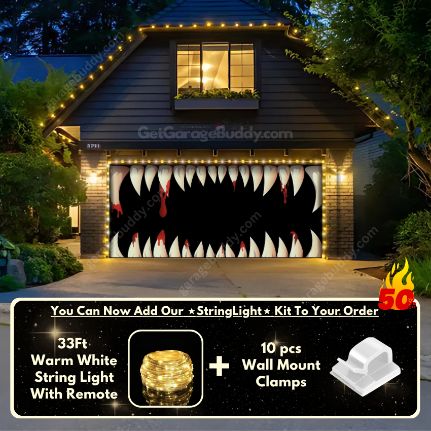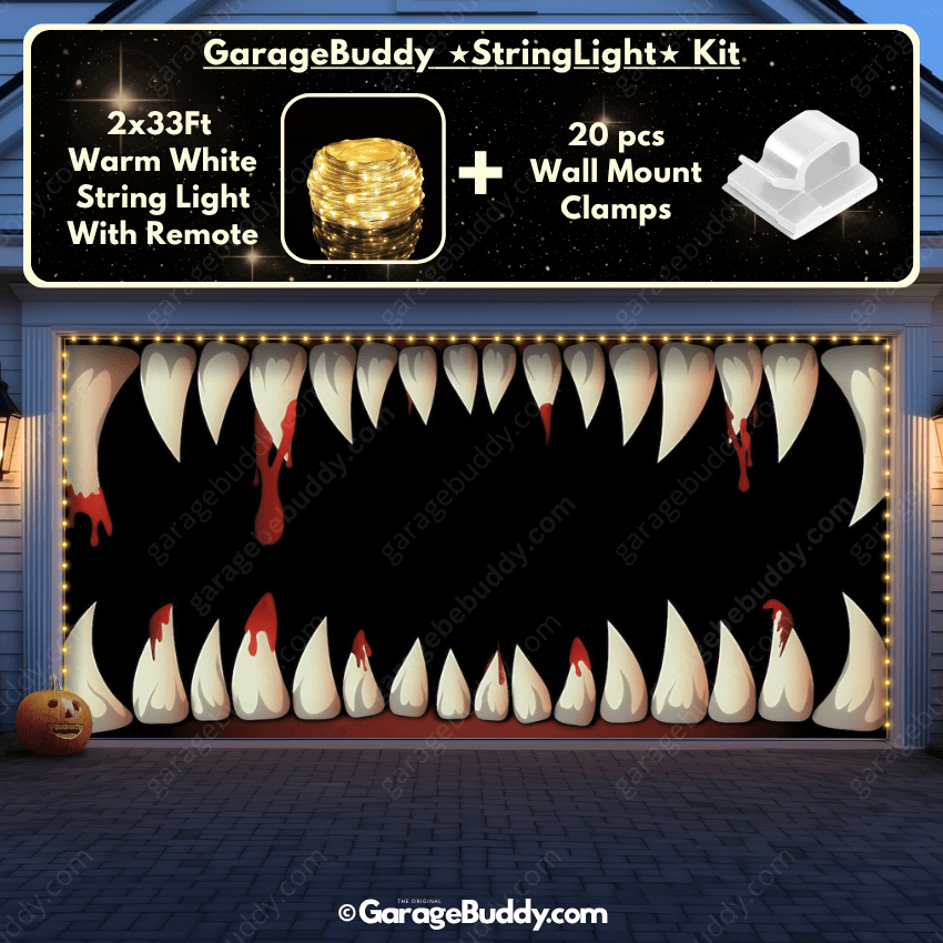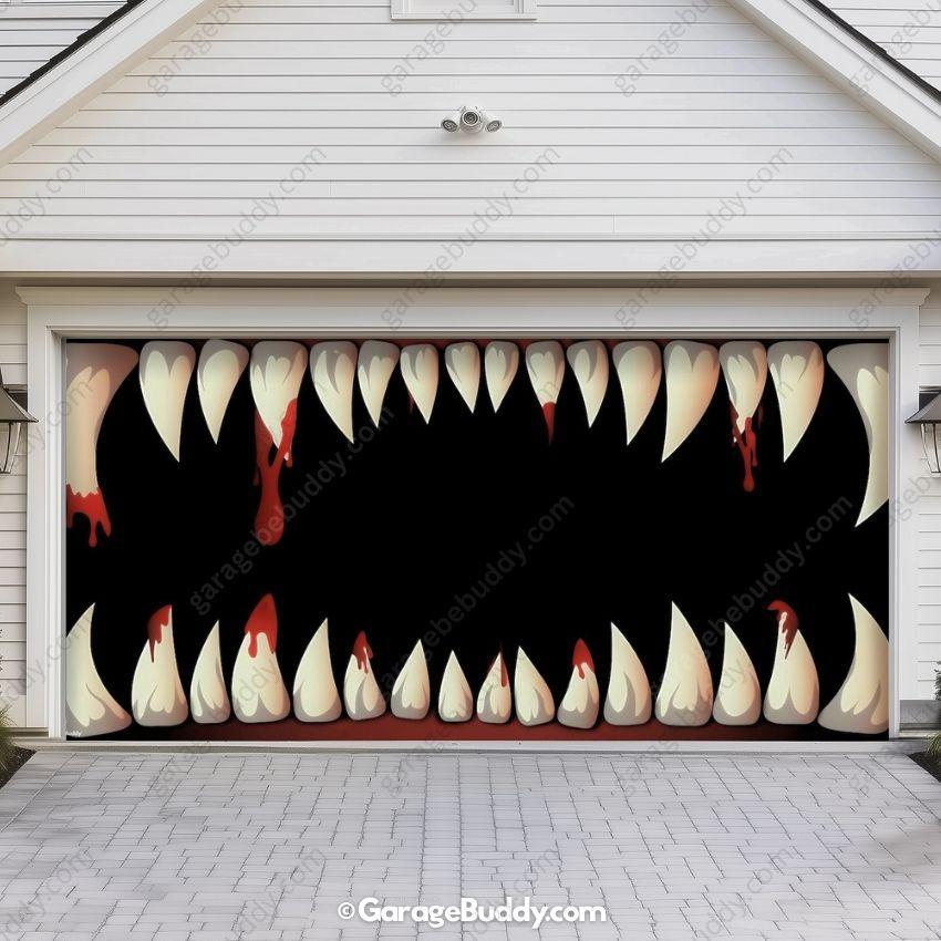 Enhance your Halloween décor with our monster’s mouth Halloween garage door cover! Featuring a bold graphic with sharp, long teeth, this playful yet spooky design adds a fun, eerie touch to your home, making it the perfect outdoor Halloween decoration for trick-or-treaters and guests alike. It’s one of those Halloween décor ideas that makes your home unforgettable.