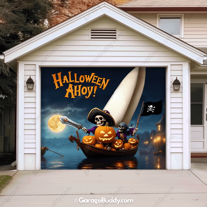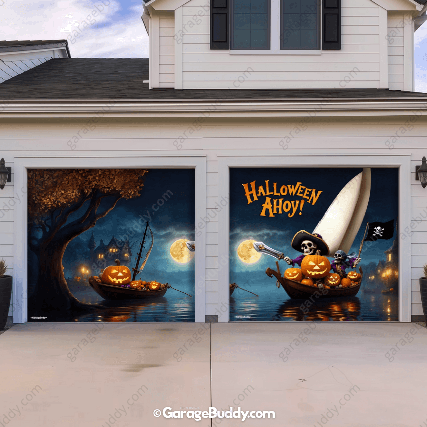 Climb aboard the creepiest ship on the seas! With pirate skeletons, glowing jack-o’-lanterns, and a full moon backdrop, this Halloween garage door cover brings haunted adventure to your home. Perfect for those who want a bold Halloween garage decoration idea that instantly transforms their house into a spooky landmark.