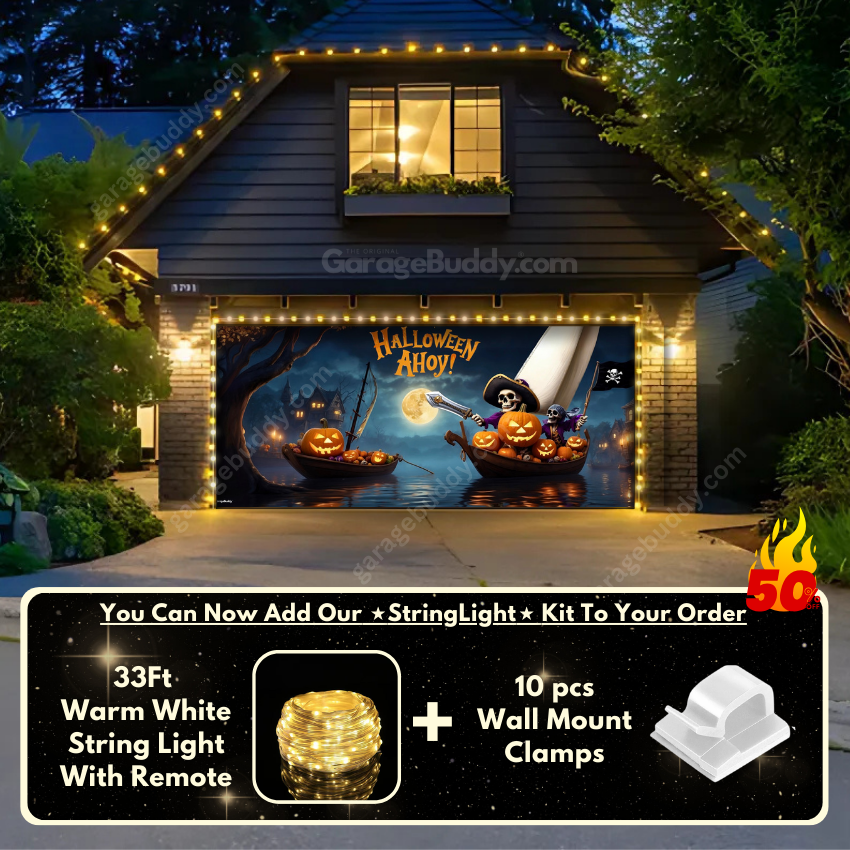 You now have the option to add the GarageBuddy string light kit to your order at 50% Off and turn your garage into a true showstopper. Pairing these lights with a Halloween garage door cover or even a creepy garage door cover makes your home shine brighter and scarier than ever!