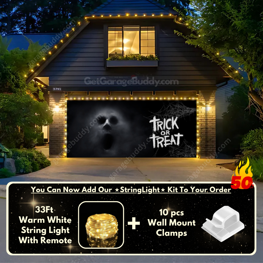 You now have the option to add the GarageBuddy string light kit to your order at 50% off and turn your Halloween garage decorations into a true showstopper. The kit includes 1x 33 ft warm white string light, a remote control, and 10x sticky wall mount clamps. The 2-door garage option comes with 2 string light kits. The lights work on three AA batteries (not included), so you don’t need to run around finding electrical outlets—making your Halloween garage door cover glow creepier than ever.
