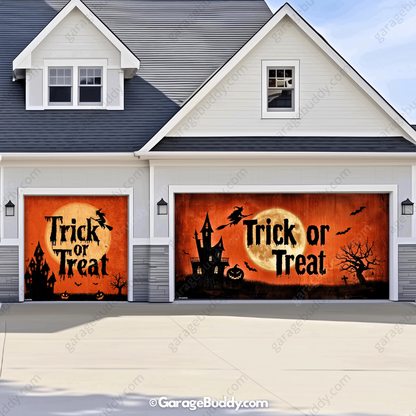 Whether you’re handing out candy or haunting the block, this eerie vintage Halloween garage door cover with its shadowy castle and flying witch tells every visitor: spooky season is officially on.