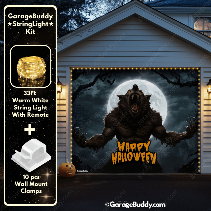 You now have the option to add the GarageBuddy string light kit to your order at 50% Off and turn your Halloween garage decoration into a true show stopper. The kit includes 1x 33 ft warm white string light, a remote control, and 10x sticky wall mount clamps. The 2-door garage option comes with 2 string light kits. The lights work on three AA batteries (not included), so you don’t need to run around finding electrical outlets. Combine them with your creepy garage door cover for the ultimate haunted house vibe.