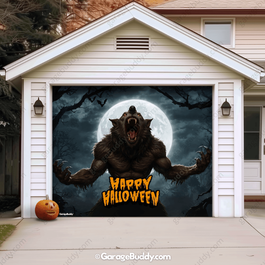 A heart-pounding scene featuring a colossal werewolf growling menacingly in a shadowy forest. A ghostly full moon bathes the scene in eerie light, enhancing the werewolf’s fearsome presence and transforming your home with a Halloween garage door cover into a chilling nocturnal nightmare. This spooky garage door cover instantly makes your house the star of the neighborhood.